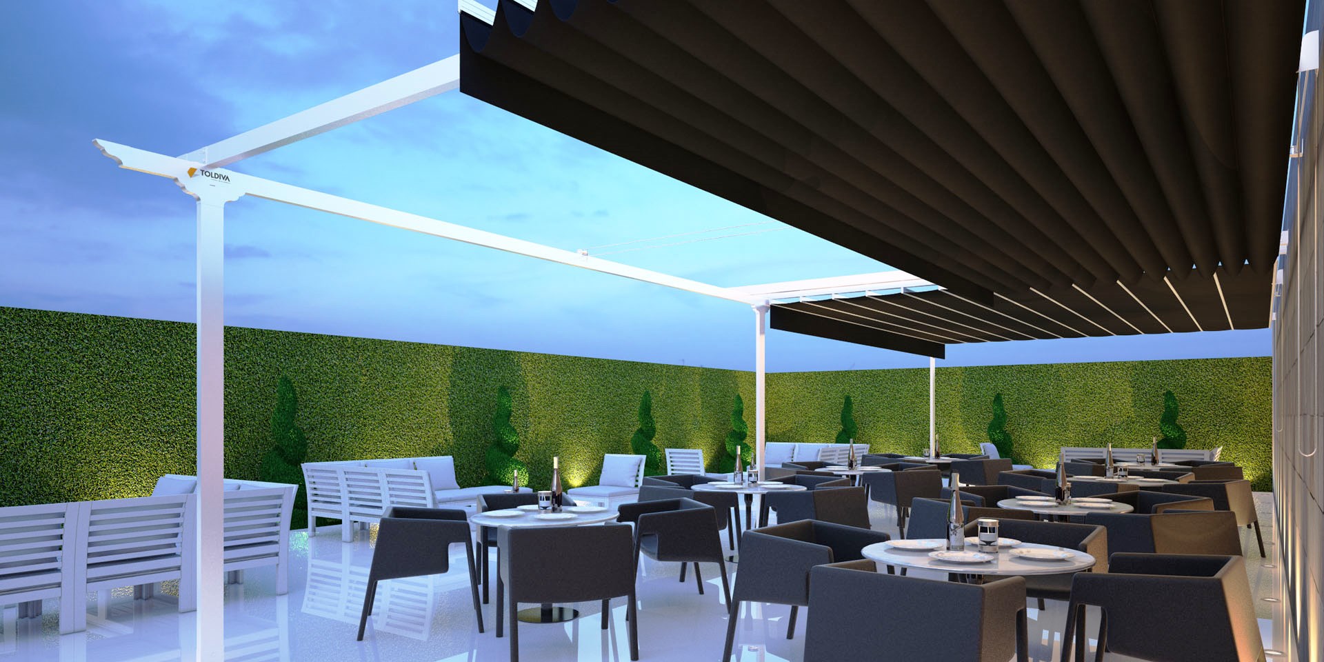 El techo retráctil es una de las formas más elegantes y sencillas de protegerse del sol. Resulta una solución adecuada para cualquier tipo de terreno gracias a sus piezas de conexión que permiten su montaje en grandes dimensiones. Es un sistema que se integra a la perfección en cualquier tipo de entorno, incluso en superficies irregulares gracias a la sencillez de sus formas y a su alta funcionalidad.